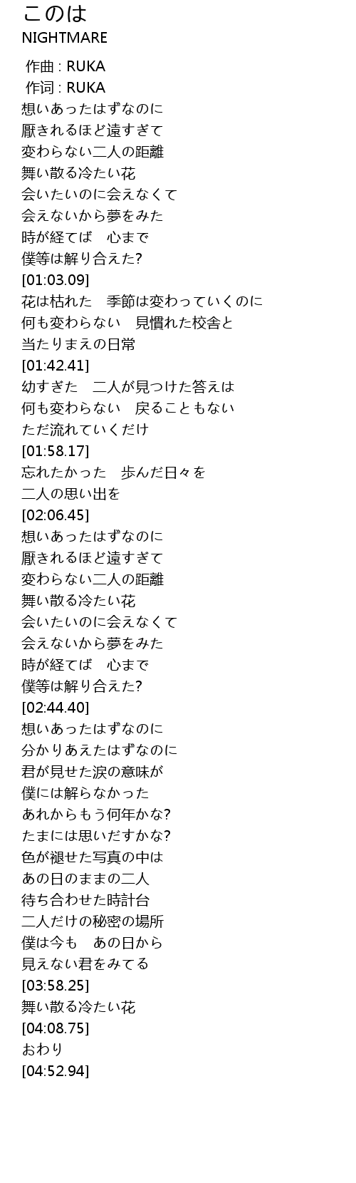 | [03:58.84] | 舞い散る冷たい花 |