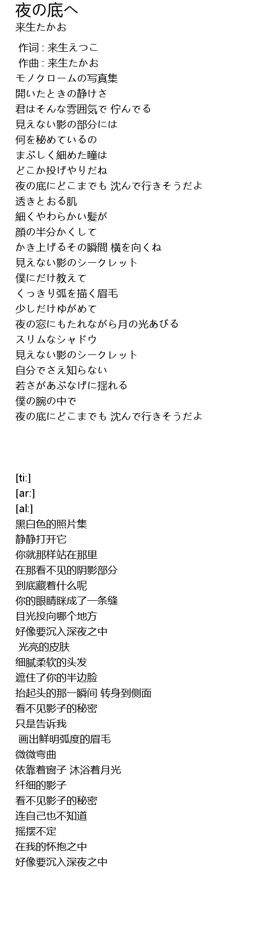 | [00:01.000] | 作曲 : 来生たかお |