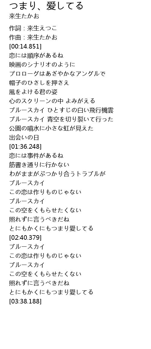 | [01:03.360] | ブルースカイ ひとすじの白い飛行機雲 |
