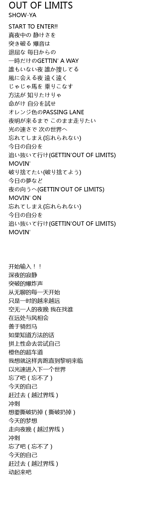 | [02:34.645] | yè xiàng GETTIN' OUT OF LIMITS |