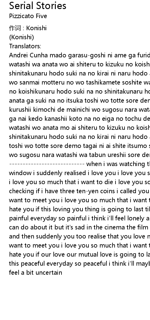 | Andrei Cunha mado garasugoshi ni ame ga furidasu no wo mitetara totsuzen watashi wa anata wo ai shiteru to kizuku no koishikunaru hodo suki na no shinitakunaru hodo suki na no kirai ni naru hodo anata ga suki na no juendama wo sanmai motteru no wo tashikamete soshite watashi wa anata ni denwa wo kakeru no koishikunaru hodo suki na no shinitakunaru hodo suki na no kirai ni naru hodo anata ga suki na no itsuka toshi wo totte sore demo anata wo ai shite itsumo kurushii kimochi de mainichi wo sugosu nara watashi wa nandaka samishii shikata ga nai kedo kanashii koto na no eiga no tochu de film ga fui ni togirete soshite watashi wo anata mo ai shiteru to kizuku no koishikunaru hodo suki na no shinitakunaru hodo suki na no kirai ni naru hodo anata ga suki na no itsuka toshi wo totte sore demo tagai ni ai shite itsumo shizuka na kimochi de mainichi wo sugosu nara watashi wa tabun ureshii sore demo nandaka sukoshi tomadou no when i was watching the rain falling through the window i suddenly realised i love you i love you so much that i want to meet you i love you so much that i want to die i love you so much that i hate you after checking if i have three tenyen coins i called you i love you so much that i want to meet you i love you so much that i want to die i love you so much that i hate you if this loving you thing is going to last till i get old always this painful everyday so painful i think i' ll feel lonely and sad there' s nothing one can do about it but it' s sad in the cinema the film gets stuck halfway through and then suddenly you too realise that you love me i love you so much that i want to meet you i love you so much that i want to die i love you so much that i hate you if our love our mutual love is going to last till we get old always this peaceful everyday so peaceful i think i' ll maybe be happy but even so i feel a bit uncertain |