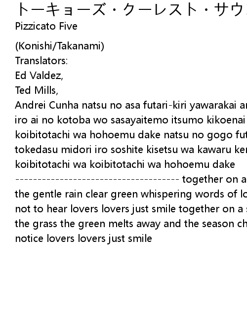 Andrei Cunha natsu no asa futari-kiri yawarakai ame wo abite sukitooru midori iro ai no kotoba wo sasayaitemo itsumo kikoenai furi koibitotachi wa koibitotachi wa hohoemu dake natsu no gogo futari-kiri kusa no ue madoronde iru tokedasu midori iro soshite kisetsu wa kawaru keredo nani mo kizukanai furi koibitotachi wa koibitotachi wa hohoemu dake ------------------------------------- together on a summer morning basking in the gentle rain clear green whispering words of love but lovers always pretend not to hear lovers lovers just smile together on a summer afternoon sleeping on the grass the green melts away and the season changes but lovers pretend not to notice lovers lovers just smile