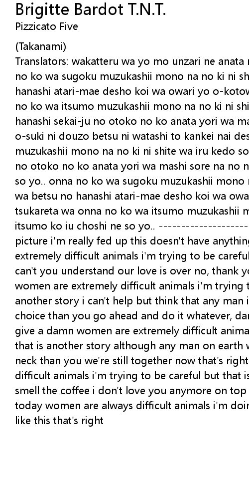 Translators: wakatteru wa yo mo unzari ne anata nanka ni kankei nai desho onna no ko wa sugoku muzukashii mono na no ki ni shite wa iru kedo sore wa betsu no hanashi atari-mae desho koi wa owari yo o-kotowari da wa ii-kagen ni shite onna no ko wa itsumo muzukashii mono na no ki ni shite wa iru kedo sore wa betsu no hanashi sekai-ju no otoko no ko anata yori wa mashi kamo ne kamawanai wa yo o-suki ni douzo betsu ni watashi to kankei nai desho onna no ko wa sugoku muzukashii mono na no ki ni shite wa iru kedo sore wa betsu no hanashi sekai-ju no otoko no ko anata yori wa mashi sore na no ni ima mo mada anata to iru kedo so yo.. onna no ko wa sugoku muzukashii mono na no ki ni shite wa iru kedo sore wa betsu no hanashi atari-mae desho koi wa owari yo sonna koto yori kyo wa tsukareta wa onna no ko wa itsumo muzukashii mono na no ki ni shite wa iru kedo itsumo ko iu choshi ne so yo.. ----------------------------- ok i get the picture i'm really fed up this doesn't have anything to do with you women are extremely difficult animals i'm trying to be careful but that is another story can't you understand our love is over no, thank you very much get real, honey women are extremely difficult animals i'm trying to be careful but that is another story i can't help but think that any man in the world would be a better choice than you go ahead and do it whatever, darling honestly my dear i don't give a damn women are extremely difficult animals i'm trying to be careful but that is another story although any man on earth would be less of a pain in the neck than you we're still together now that's right women are extremely difficult animals i'm trying to be careful but that is another story wake up and smell the coffee i don't love you anymore on top of that i've had enough for today women are always difficult animals i'm doing my best here but i am always like this that's right |
