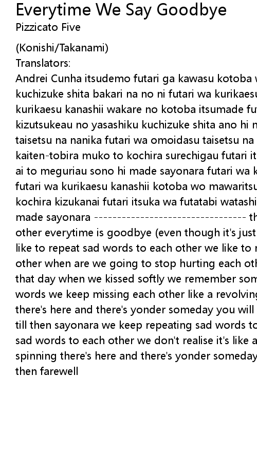 Andrei Cunha itsudemo futari ga kawasu kotoba wa sayonara dake yasashiku kuchizuke shita bakari na no ni futari wa kurikaesu kanashii kotoba wo futari wa kurikaesu kanashii wakare no kotoba itsumade futari tada wake mo naku kizutsukeau no yasashiku kuchizuke shita ano hi no koto futari wa omoidasu taisetsu na nanika futari wa omoidasu taisetsu na kotoba mawaritsuzukeru kaiten-tobira muko to kochira surechigau futari itsuka wa anata wa shiawase na ai to meguriau sono hi made sayonara futari wa kurikaesu kanashii kotoba wo futari wa kurikaesu kanashii kotoba wo mawaritsuzukeru kaiten-tobira muko to kochira kizukanai futari itsuka wa futatabi watashi to anata wa meguriau sono hi made sayonara --------------------------------- the only thing we say to each other everytime is goodbye (even though it's just after we kissed softly) we like to repeat sad words to each other we like to repeat our sad adieus to each other when are we going to stop hurting each other so pointlessly? we remember that day when we kissed softly we remember something important some important words we keep missing each other like a revolving door that goes on spinning there's here and there's yonder someday you will experience a happy love story till then sayonara we keep repeating sad words to each other we keep repeating sad words to each other we don't realise it's like a revolving door that keeps spinning there's here and there's yonder someday you and i will meet again till then farewell |