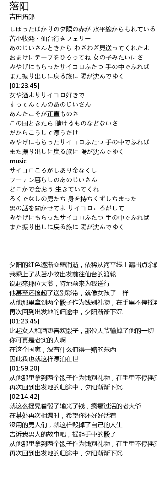 | [03:05.27] | サイコロころがしあり金なくし フーテン暮らしのあのじいさん |