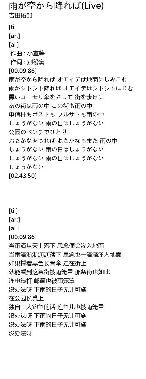 | [00:44.67] | 雨がシトシト降れば オモイデはシトシトにじむ |