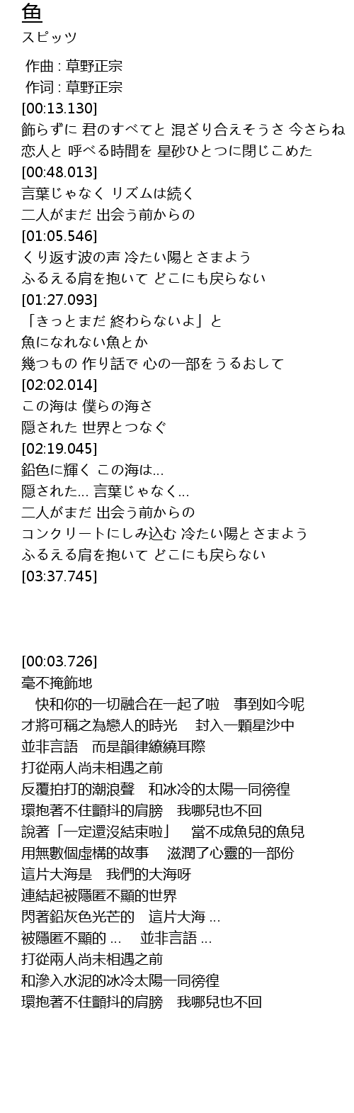 | [00:01.00] | 作词 : 草野正宗 |