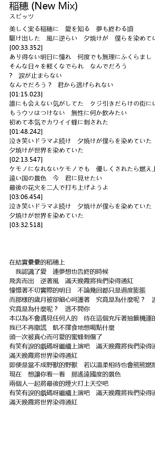 | [00:01.131] | 美しく実る稲穂に 愛を知る 夢も終わる頃 |