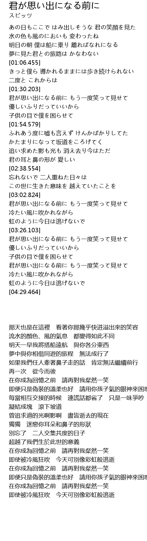 | [01:32.079] | 君が思い出になる前に もう一度笑って見せて |