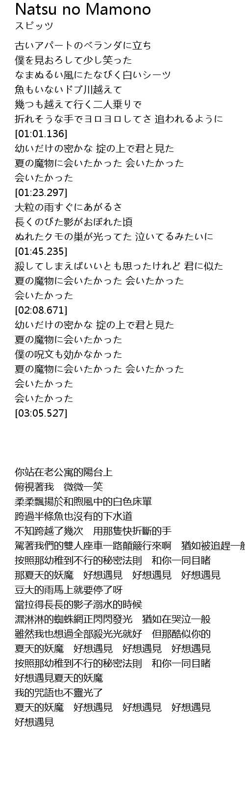 | [02:50.819] | 夏の魔物に会いたかった 会いたかった 会いたかった |