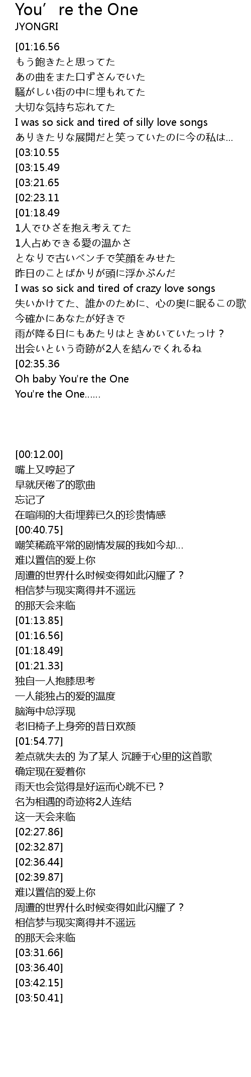 | [00:12.00][01:16.56][01:21.33][02:39.87][03:50.41] | JYONGRIYou' re the One |