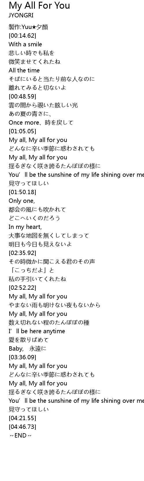 | [01:37.19] | You’ll be the sunshine of my life shining over me |