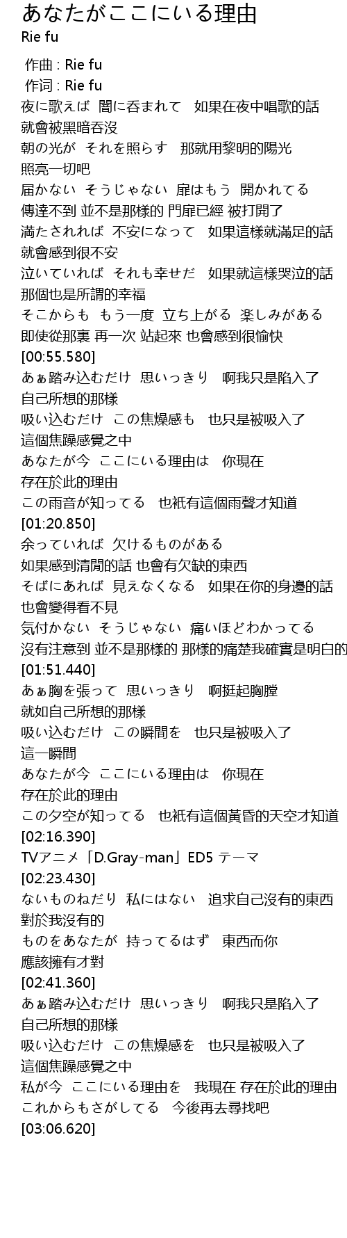 | [02:05.480] | あなたが今 ここにいる理由は 你現在 存在於此的理由 |