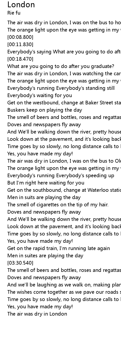 | [00:02.480] | The air was dry in London, I was on the bus to holborn |
