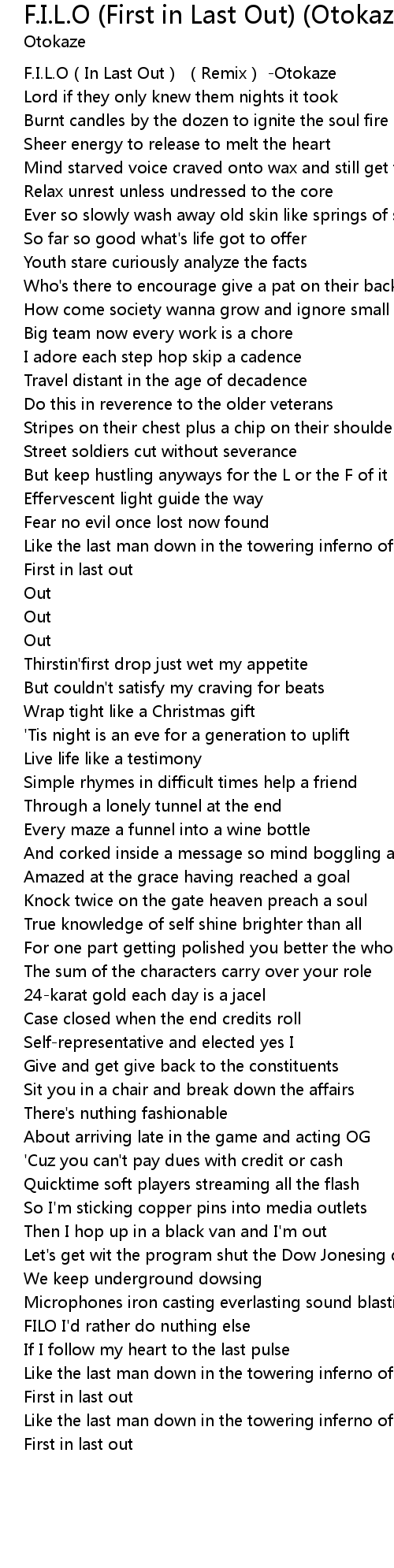 | [00:00.223] | F. I. L. O In Last Out Remix Otokaze |