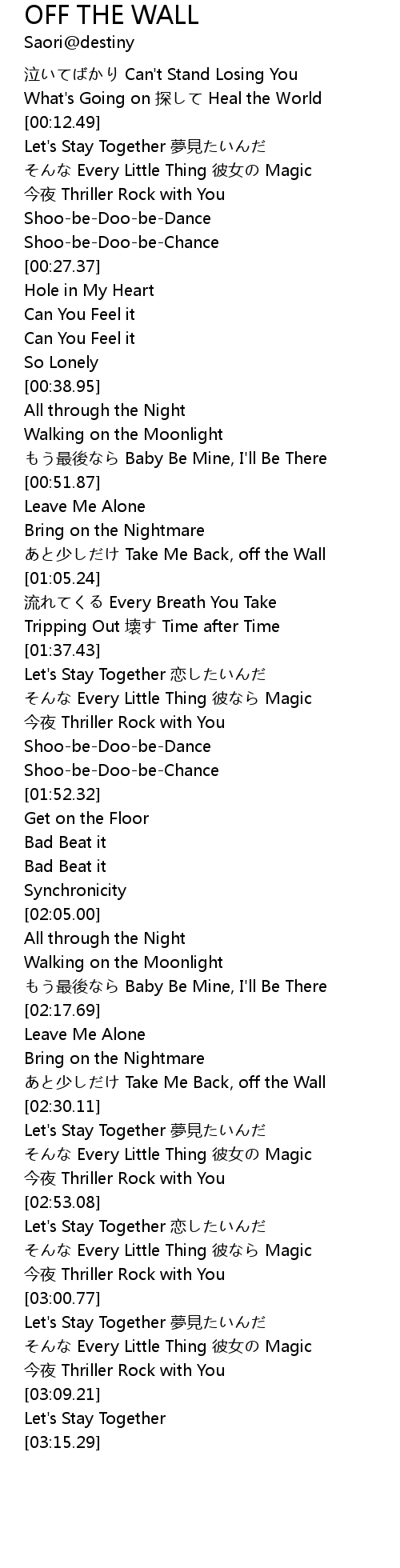 | [01:00.47] | あと少しだけ Take Me Back, off the Wall |
