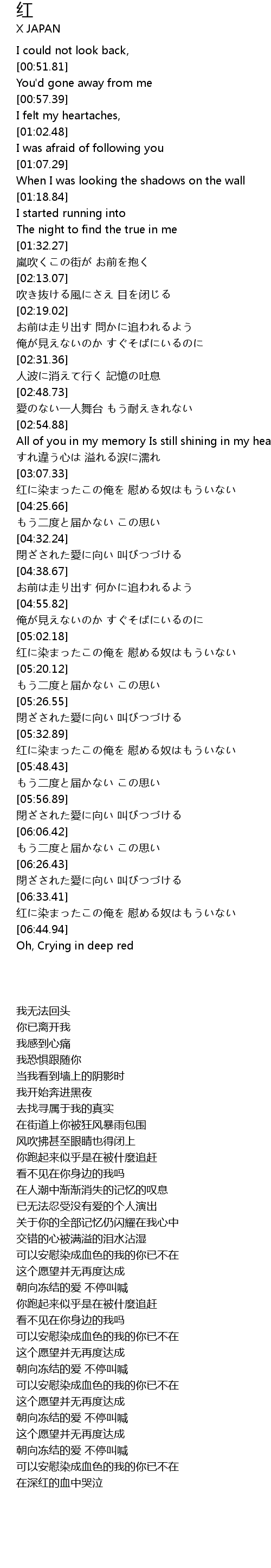 | [04:14.21] | 红に染まったこの俺を 慰める奴はもういない |
