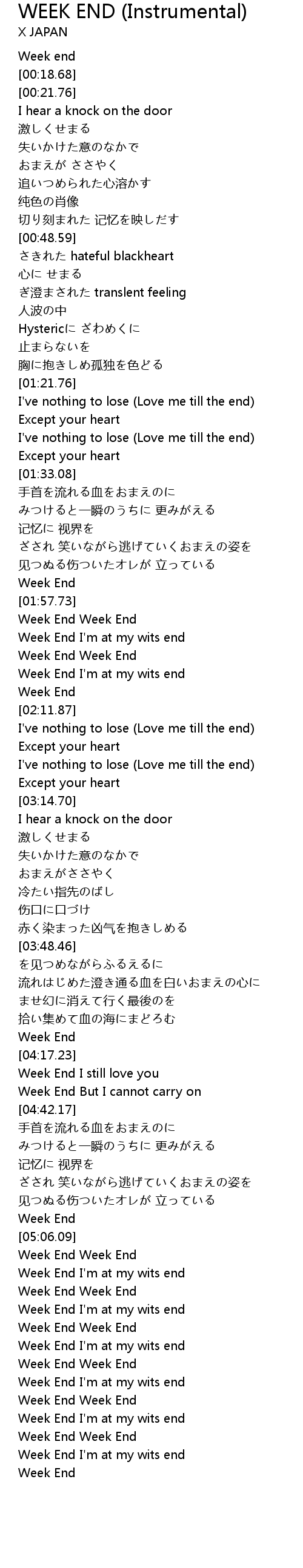 | [02:01.28] | Week End I'm at my wits end |