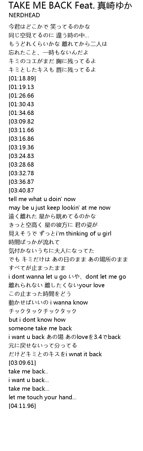 | [04:28.23][03:09.82][01:35.09] | take me back i want u back |