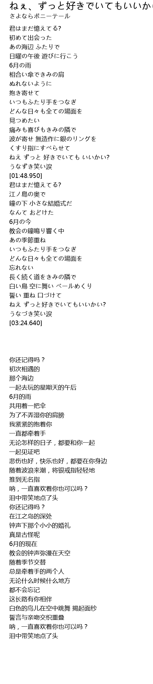 | [01:35.100] | ねえ ずっと 好きでいても いいかい? |