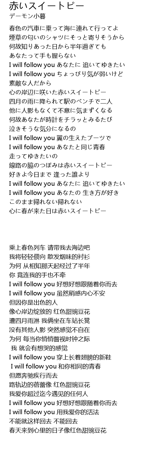 | [00:49.13] | I will follow you あなたに 追いてゆきたい |