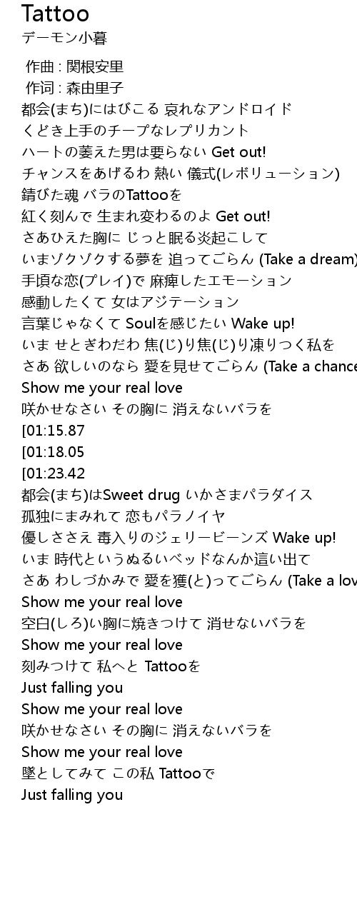 | [02:14.23][01:18.05] | 墜としてみて この私 Tattooで |