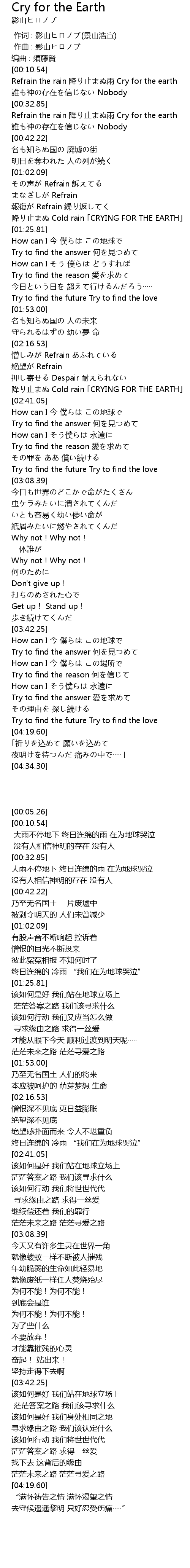 | [02:33.34] | 降り止まぬ Cold rain 「CRYING FOR THE EARTH」 |