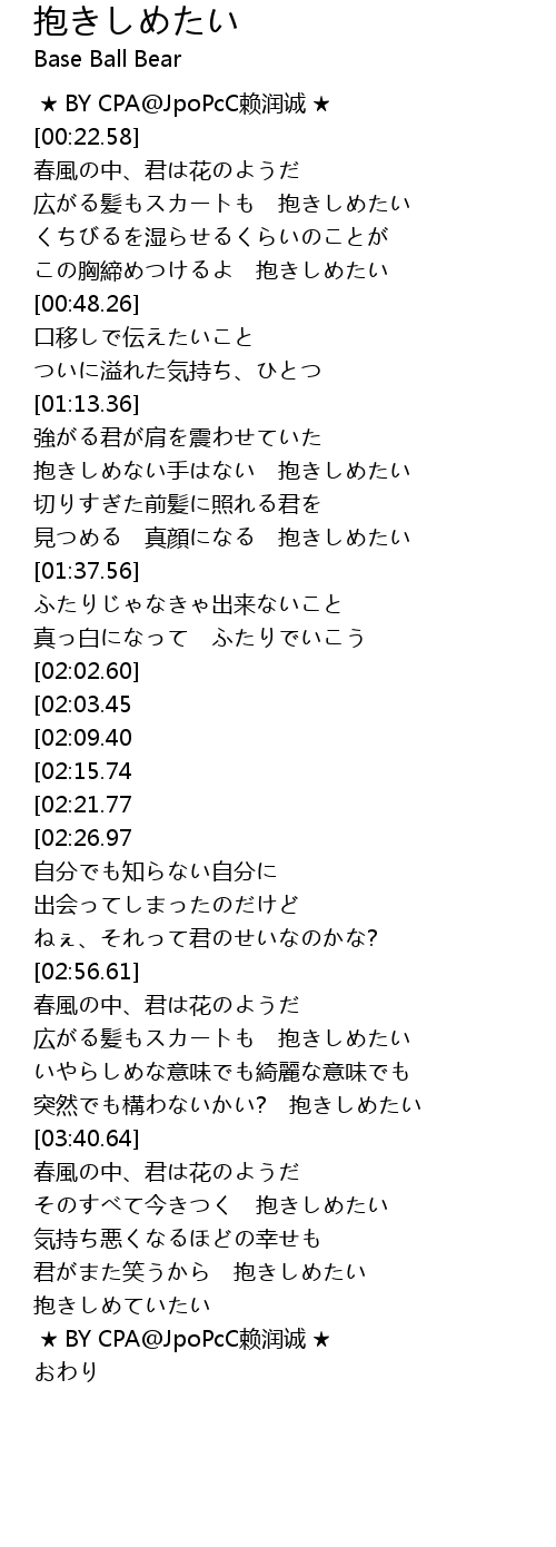 | [04:12.55][02:09.40] | つられて笑った 抱きしめたい |