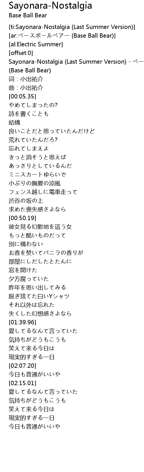 | [00:00.00] | Sayonara-Nostalgia (Last Summer Version) - ベースボールベアー (Base Ball Bear) |