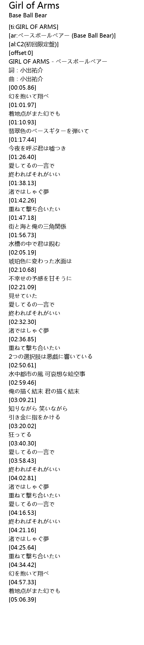 | [00:00.65] | GIRL OF ARMS - ベースボールベアー |