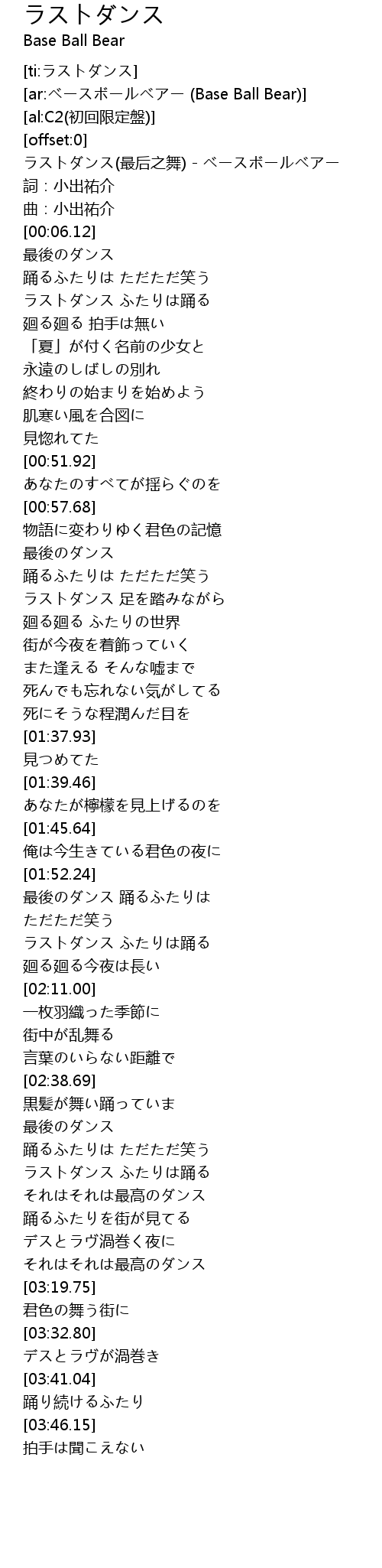 | [00:00.93] | ラストダンス(最后之舞) - ベースボールベアー |