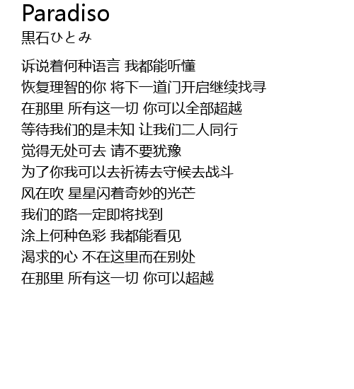| [01:14.30] | 等待我们的是未知 让我们二人同行 |