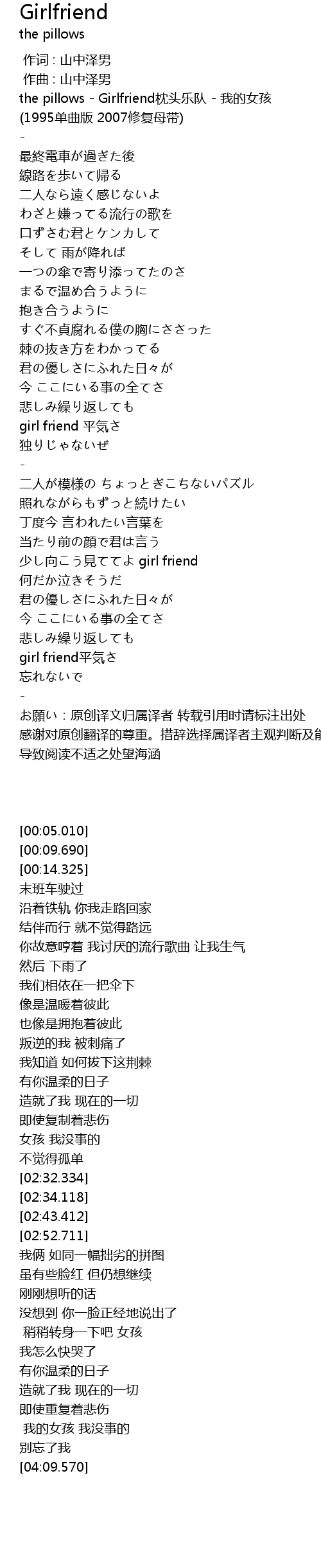 | [00:05.010] | the pillows - Girlfriend枕头乐队 - 我的女孩 |