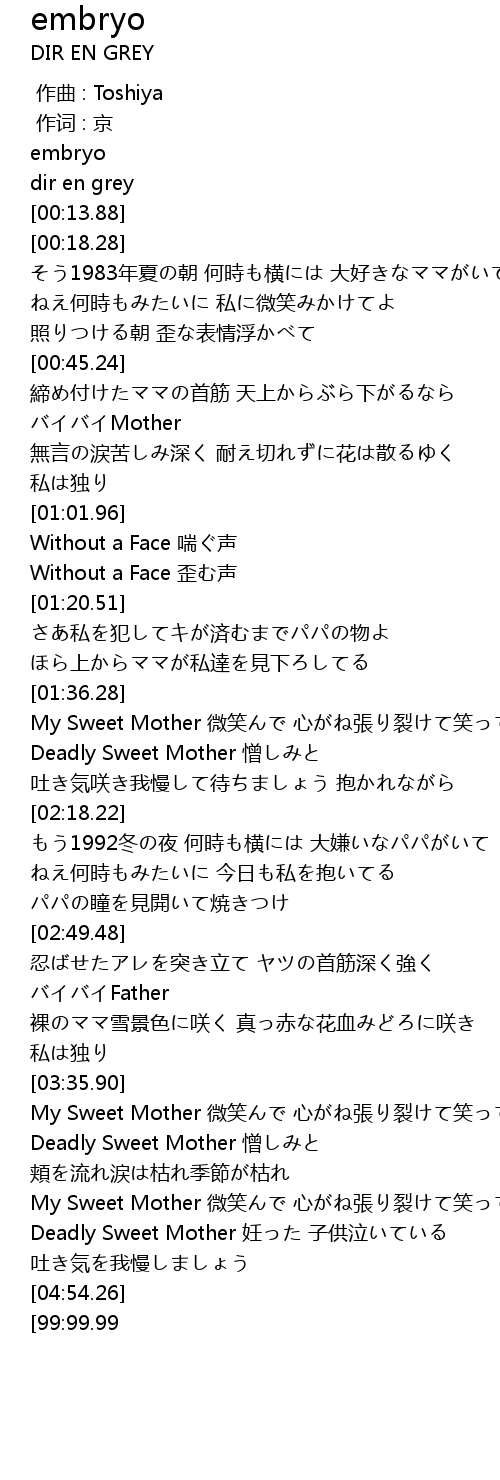 | [04:29.84] | Deadly Sweet Mother 妊った 子供泣いている 吐き気を我慢しましょう |