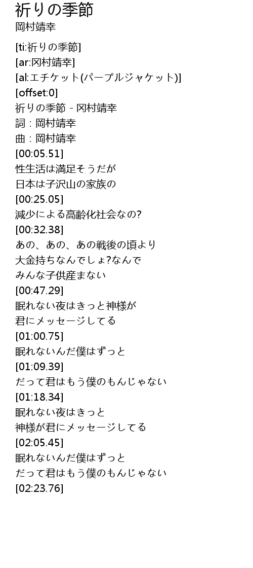 | [00:01.11] | 祈りの季節 - 冈村靖幸 |