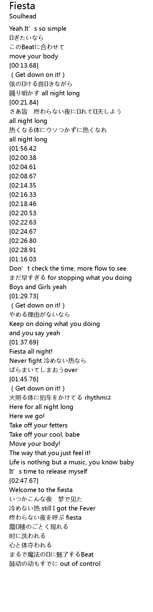| [03:29.44][02:14.35][00:58.91] | Welcome to the fiesta |