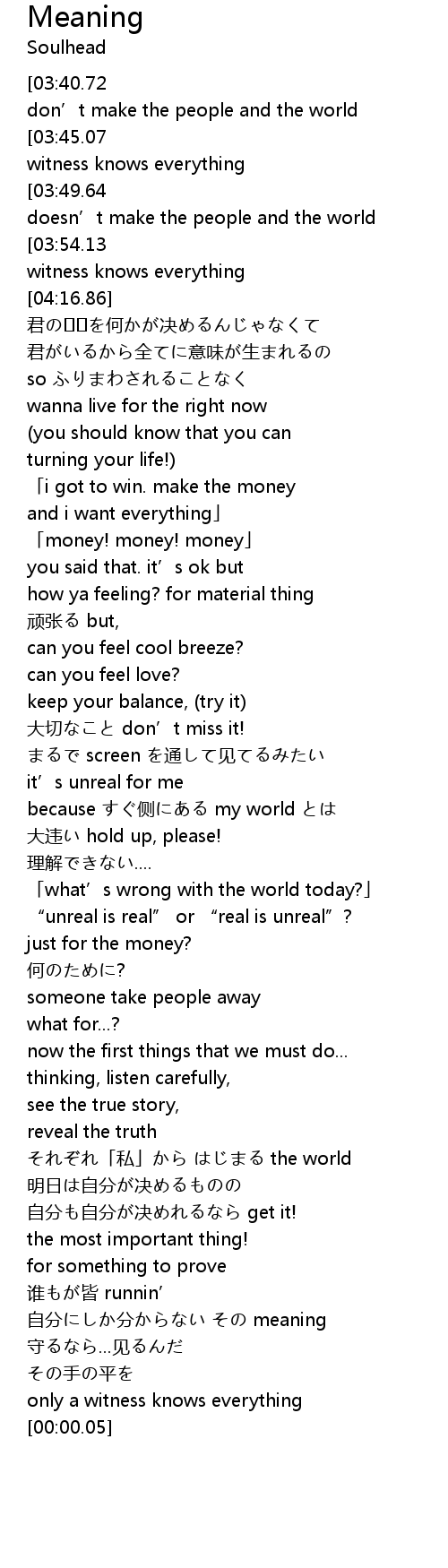 | [03:58.68][03:40.72][02:37.33][02:19.51][01:24.67][01:07.05][00:12.43] | money don' t make the people and the world |