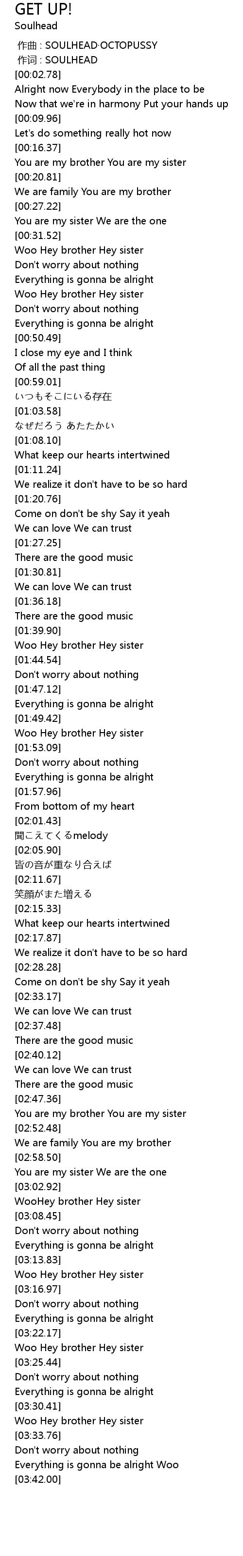| [03:31.64] | Woo Hey brother Hey sister |