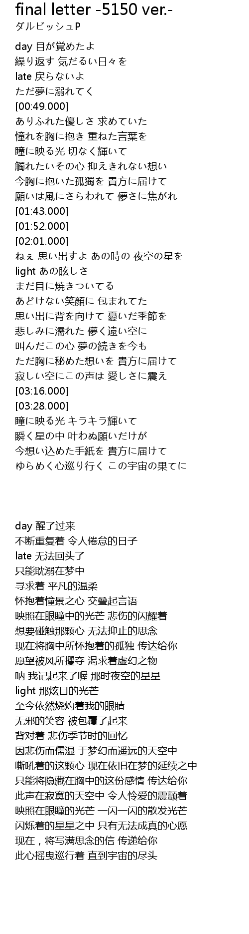 | [03:52.500] | 今想い込めた手紙を 貴方に届けて |