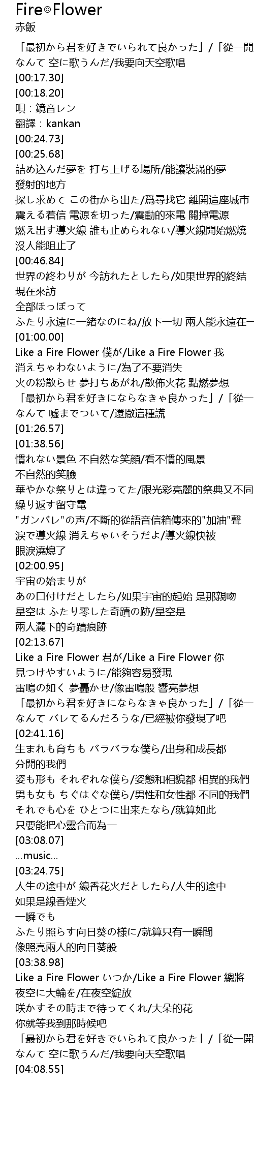 | [02:14.47] | Like a Fire Flower jūn Like a Fire Flower nǐ |