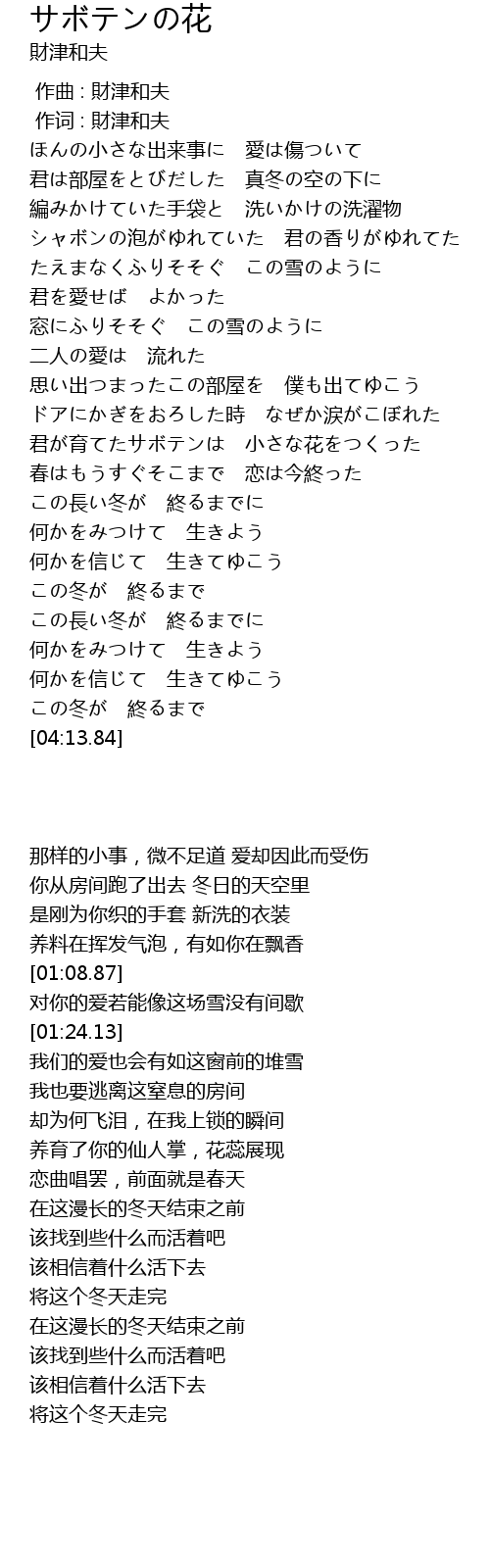 | [02:41.11] | 君が育てたサボテンは 小さな花をつくった |