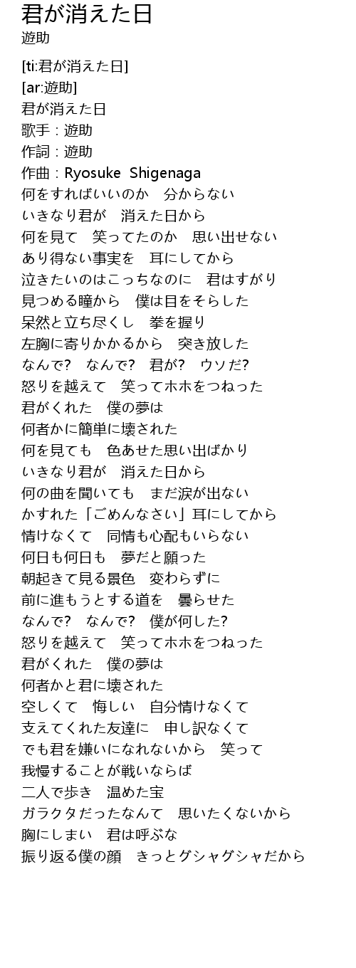 | [00:14.50] | 作曲:Ryosuke Shigenaga |