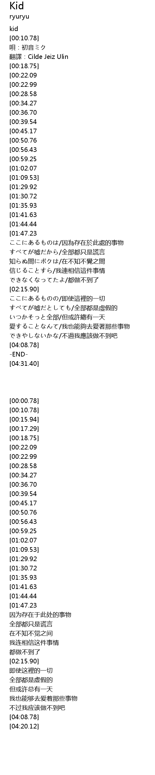 | [03:40.19][01:47.23] | 忘れてしまったよ/全部都忘卻而去 |