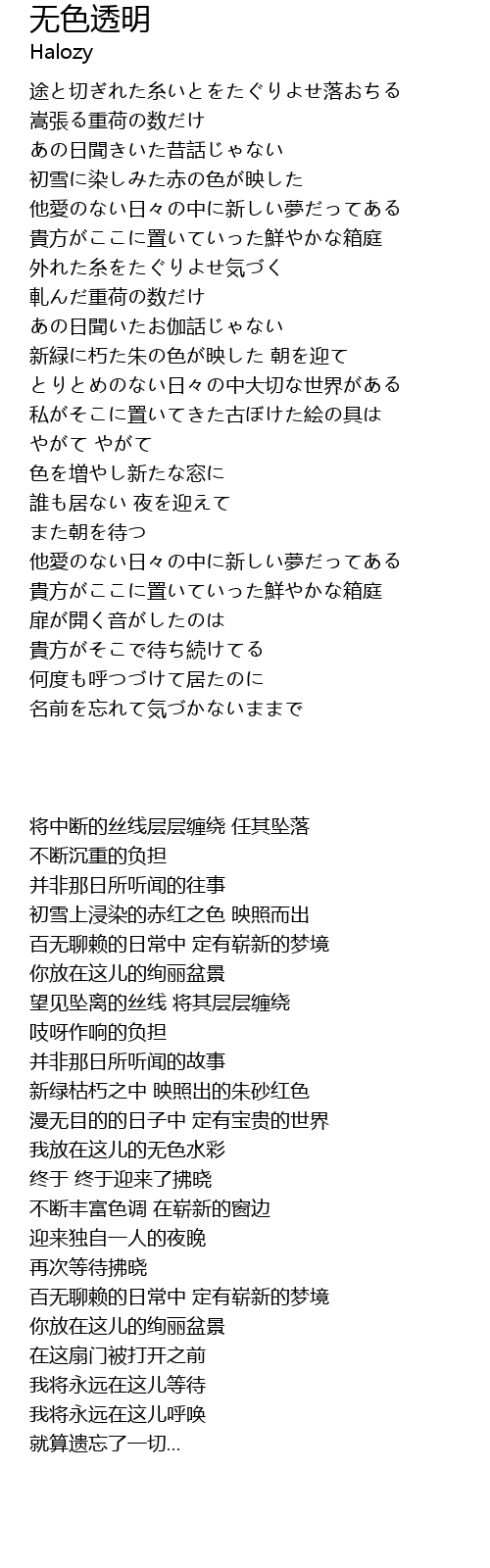| [02:04.253] | 新緑に朽た朱の色が映した 朝を迎て |