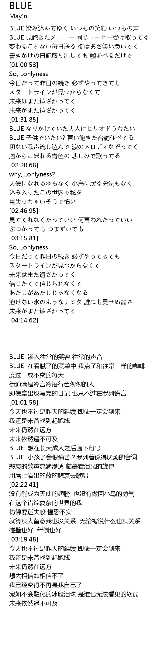 | [01:34.01] | BLUE なりかけていた大人にピリオドうちたい |