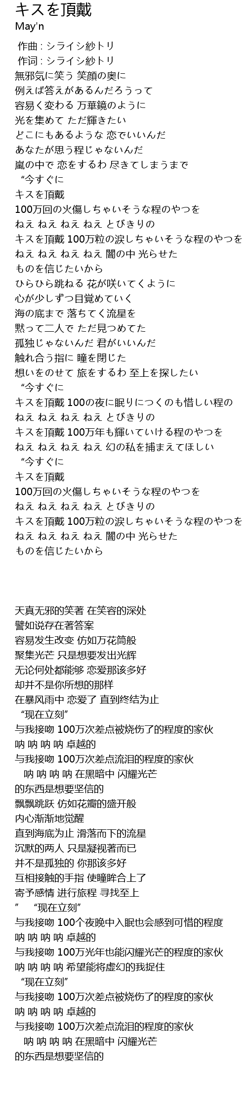| [02:56.060] | キスを頂戴 100万回の火傷しちゃいそうな程のやつを |