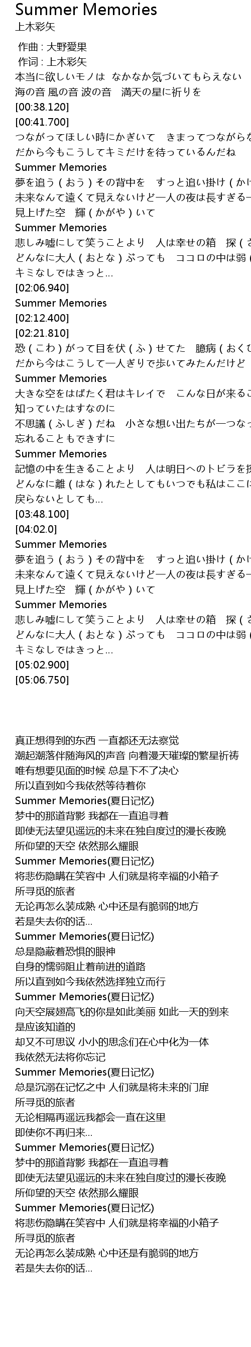 | [03:04.130] | 不思議(ふしぎ)だね 小さな想い出たちが一つなってココロの中 |