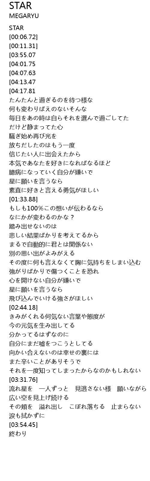 | [04:36.89][04:13.47][03:03.18][01:52.99][00:31.06] | OH SHINING STAR |