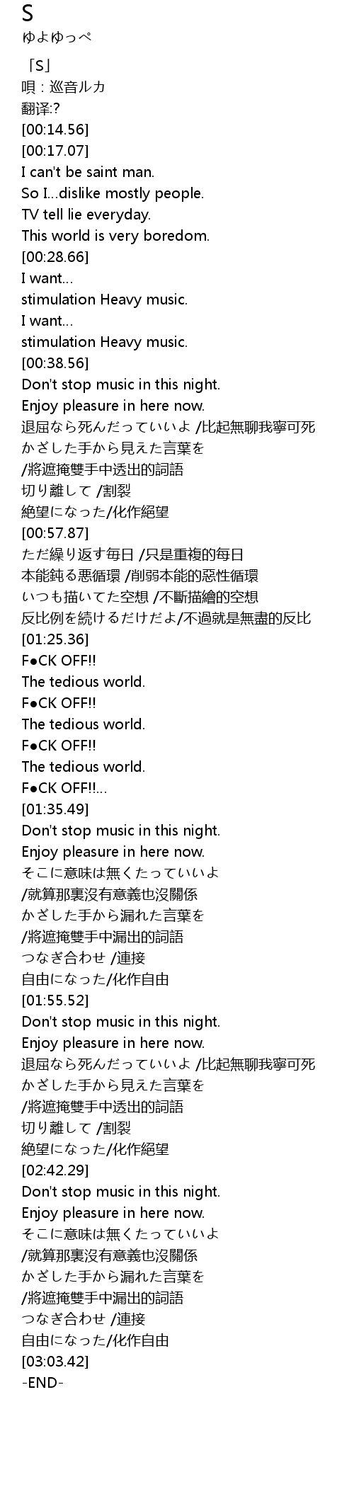 | [00:43.36] | 退屈なら死んだっていいよ /比起無聊我寧可死 |