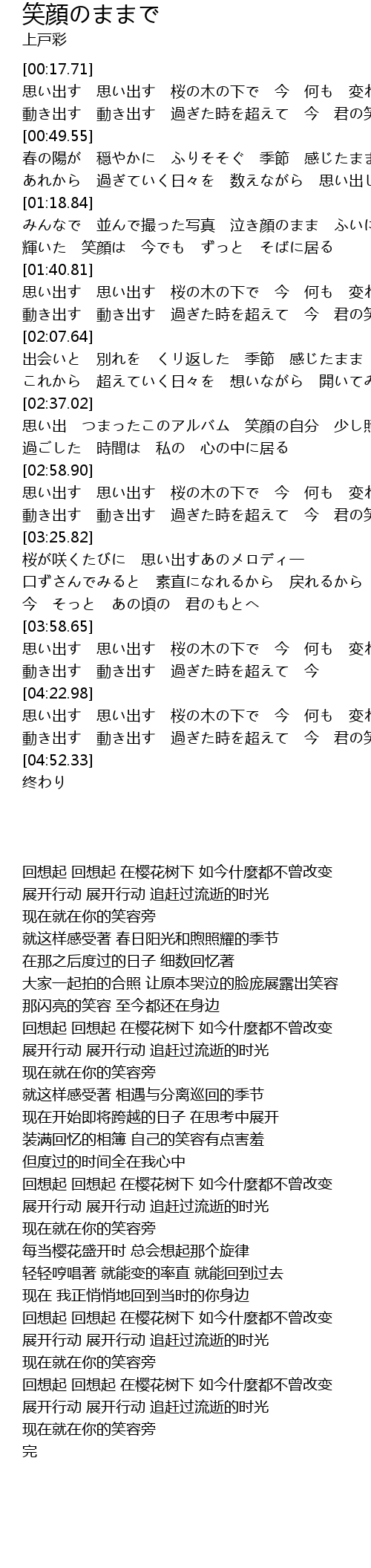 | [00:23.72] | 思い出す 思い出す 桜の木の下で 今 何も 変わらないまま |